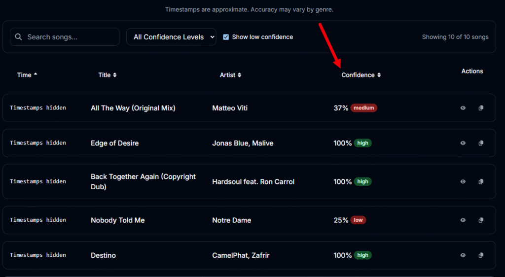 Understanding Results: Most tools provide timestamps showing when each track starts. Some services (like ourselves!) offer confidence scores indicating how certain the identification is.