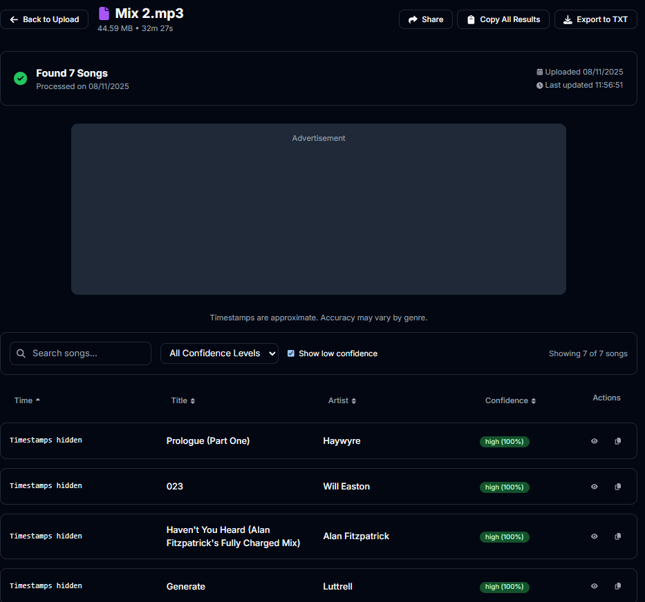 You can upload audio files directly or record live sets for identification. The tool performs particularly well with minimal techno, acid house, and harder techno variants.